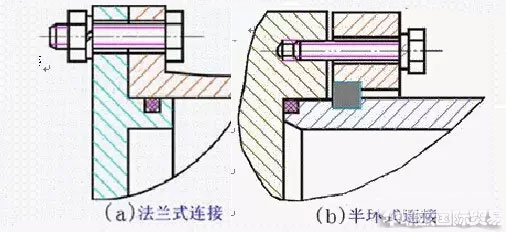 (2)半環(huán)式連接,分為外半環(huán)連接和內(nèi)半環(huán)連接兩種連接形式,半環(huán)連接工藝性好,連接可靠,結(jié)構(gòu)緊湊,但削弱了缸筒強(qiáng)度。半環(huán)連接應(yīng)用十分普遍,常用于無(wú)縫鋼管缸筒與端蓋的連接中。