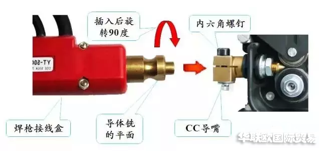 將BINZEL焊槍接線盒銅導體銑的平面處對準CC導嘴的內六角螺釘推入,再將接線盒旋轉90度后擰緊內六角螺釘。