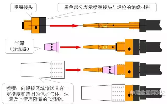 導電嘴與噴嘴應保持良好的絕緣狀態(tài),氣篩除可使保護氣體分布更均勻,保護效果更好外,還可加大導電嘴與噴嘴之間的絕緣距離。焊接時應使用防堵劑并及時清理噴嘴內的飛濺物,使用防堵劑應注意不要流淌到氣篩上,以免堵塞氣篩的氣孔,影響保護效果導致焊縫出現氣孔。