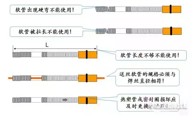•軟管變形:軟管因擠壓變形或出現硬彎均會明顯增大送絲阻力。