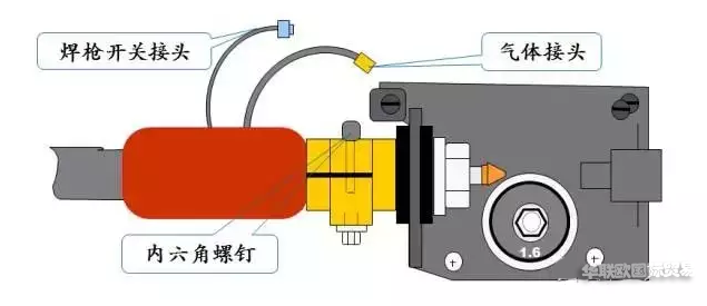 內六角螺釘必須擰緊,否則CC導嘴和接線盒連接松動,幾百安的焊接電流流過時,將導致松動處發(fā)熱,使得焊接規(guī)范不匹配并造成接線盒與CC導嘴絕緣墊燒毀。