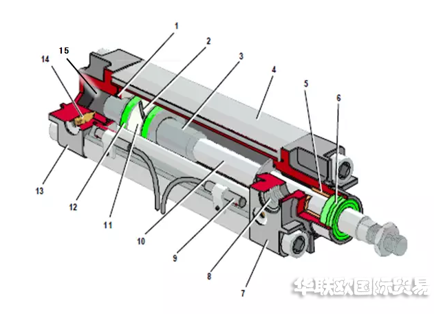 2-活塞3-緩沖柱塞 4-缸筒 5-導向套 6-防塵圈 7-前端蓋 8-氣口 9-傳感器 10-活塞桿 11-耐磨環 12-密封圈 13-后端蓋 14-緩沖節流閥 15-緩沖套