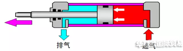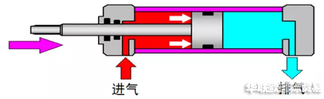 當有桿腔進氣,無桿腔排氣時,使活塞桿縮回。若有桿腔和無桿腔交替進氣和排氣,活塞實現往復直線運動。