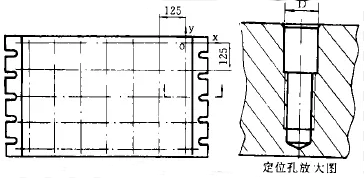 新工作臺面完成后,用加工中心加工一組定位夾緊孔。孔按一定規律排列,第一個孔在工作臺平面坐標零點,其余孔向著坐標的負方向排列,相鄰孔間距離相等。孔距設定考慮以下條件: