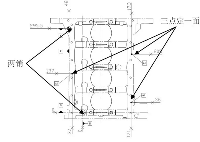 缸孔加工工藝流程如圖1所示,為保證缸孔加工精度及加工效率,缸孔加工基準(zhǔn)選擇以底面作為定位第一基準(zhǔn),靠近后端工藝銷孔作為第二基準(zhǔn),以“一面兩銷”定位模式限制了缸體6個(gè)自由度,一面兩銷定位方式如圖所示。