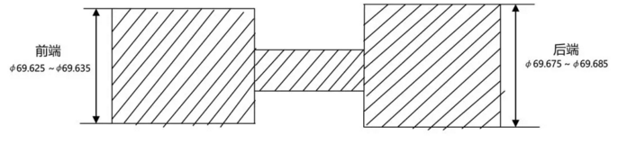 針對(duì)設(shè)備本身報(bào)警,工件從設(shè)備出來時(shí)存在漏加工情況,車間的員工、管理團(tuán)隊(duì)集思廣益,根據(jù)通止規(guī)原理,制作了一個(gè)仿通止規(guī)防錯(cuò)工具。用工具鋼車兩截外圓柱,安裝一個(gè)扶手柄,就是一個(gè)簡易的仿通止規(guī)防錯(cuò)工具。工具圓柱的前端車到比缸孔下極限尺寸69.645?mm再小0.01~0.02?mm,工具圓柱的后端車到比缸孔上極限尺寸69.665?mm再大0.01~0.02?mm。在缸孔加工時(shí),只要工件退出機(jī)床后,由操作者進(jìn)行100%四個(gè)缸孔的防錯(cuò)檢測,工具小端放得進(jìn)缸孔且同時(shí)大端放不進(jìn)缸孔則視為工件合格;工具小端放不到缸孔則缸孔異常,需要剔出返修。防錯(cuò)工具如圖所示。