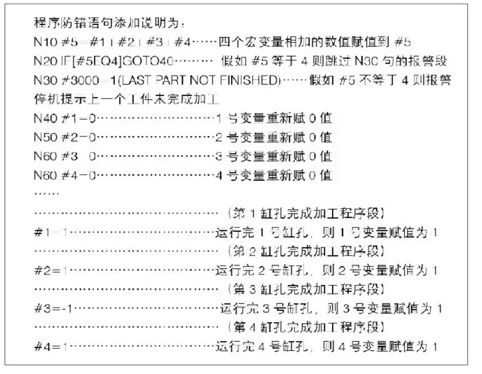 程序防錯(cuò)的原理如圖4所示。在程序開始運(yùn)行時(shí),取1號(hào)、2號(hào)、3號(hào)及4號(hào)四個(gè)宏變量,分別代表4個(gè)缸孔,同時(shí)賦值為0,而在每完成一個(gè)缸孔鏜削后,相應(yīng)的宏變量賦值為1。只有當(dāng)四個(gè)缸孔都加工完后,1號(hào)、2號(hào)、3號(hào)及4號(hào)四個(gè)變量才會(huì)都變?yōu)?,那么四個(gè)變量相加則等于4。在1號(hào)、2號(hào)、3號(hào)及4號(hào)四個(gè)宏變量賦值變?yōu)?之前,只需要判斷四個(gè)變量之和是否等于4,若等于4,則說明上一個(gè)工件已經(jīng)經(jīng)過了4個(gè)缸孔的加工,若不等于4則說明有可能存在缸孔漏加工的情況,機(jī)床報(bào)警、停機(jī)并提醒操作者。