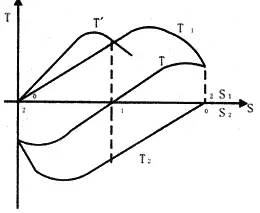 正常運(yùn)轉(zhuǎn)的伺服電動(dòng)機(jī),只要失去控制電壓,電機(jī)立即停止運(yùn)轉(zhuǎn)。當(dāng)伺服電動(dòng)機(jī)失去控制電壓后,它處于單相運(yùn)行狀態(tài),由于轉(zhuǎn)子電阻大,定子中兩個(gè)相反方向旋轉(zhuǎn)的旋轉(zhuǎn)磁場(chǎng)與轉(zhuǎn)子作用所產(chǎn)生的兩個(gè)轉(zhuǎn)矩特性(T1-S1、T2-S2曲線)以及合成轉(zhuǎn)矩特性(T-S曲線)