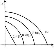 圖7 是直流伺服電動(dòng)機(jī)在不同控制電壓下(Uc為額定控制電壓)的機(jī)械特性曲線。由圖可見(jiàn):在一定負(fù)載轉(zhuǎn)矩下,當(dāng)磁通不變時(shí),如果升高電樞電壓,電機(jī)的轉(zhuǎn)速就升高;反之,降低電樞電壓,轉(zhuǎn)速就下降;當(dāng)Uc=0時(shí),電動(dòng)機(jī)立即停轉(zhuǎn)。要電動(dòng)機(jī)反轉(zhuǎn),可改變電樞電壓的極性。
