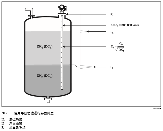 高頻脈沖信號到達介質表面,僅部分脈沖信號發生反射。上層介質的介電常數DC1較小時,未發 生反射的脈沖信號將沿探頭繼續向下傳播。在兩種介質的界面處發生第二次反射(在下層介質的介 電常數DC2大于上層介質的介電常數)。基于行程時間原理可以確定儀表至界面間的距離。同時, 還需要考慮脈沖信號在上層介質中傳播的延遲時間。介質的介電常數(DC)直接影響高頻脈沖信號的反射率。測量大介電常數(DC)的介質時(例如:水和 氨水),脈沖反射信號強;相反,測量小介電常數(DC)的介質時(例如:碳氫化合物),脈沖反射信 號弱。
